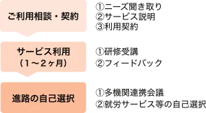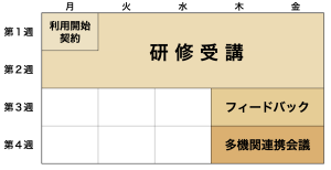利用開始時には、サービス内容の説明と契約を行い、期間の前半に受講する研修とスケジュールを決定します。