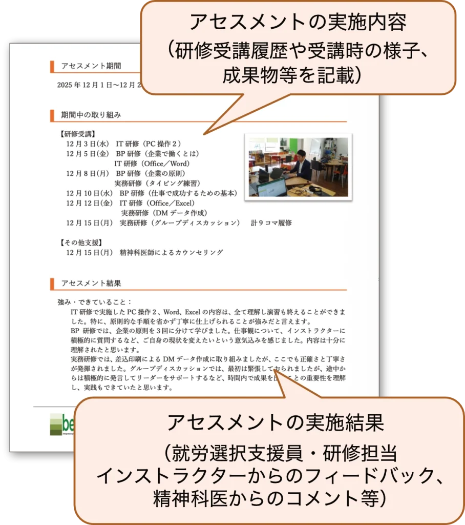①就労準備性と業務能力を客観的に評価(アセスメント)し、②希望する就労についての情報提供を行います。
