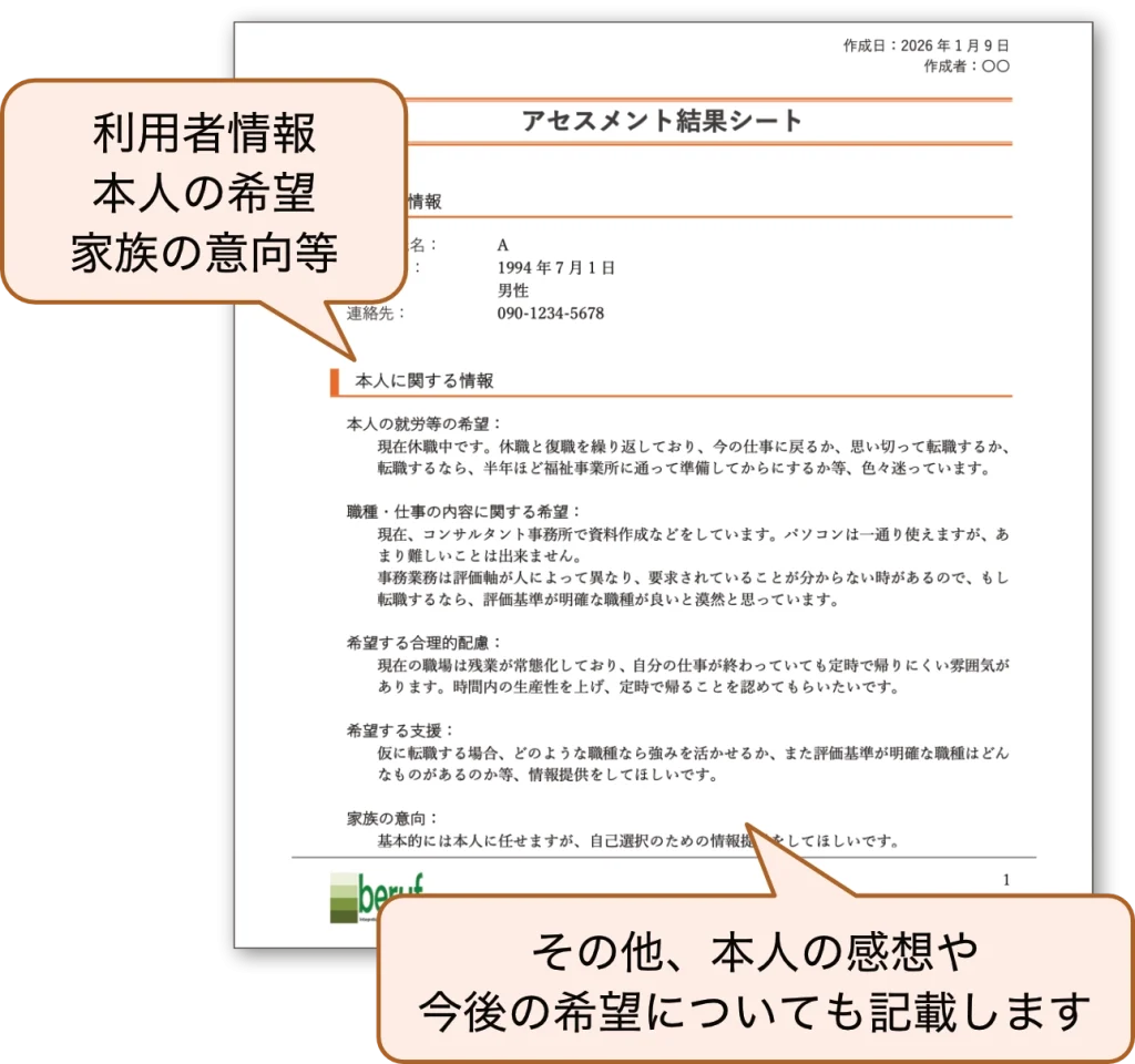 ベルーフTeilhabeを利用された全ての方に、上記の「アセスメント結果シート」をフィードバックレポートとしてお渡しします。ご本人の情報、アセスメントの実施内容、アセスメントの結果として強み・今後取り組んでほしいこと・提供した情報などをまとめてフィードバックします。下記に「アセスメント結果シート」のサンプルを掲載しています。参照ください。